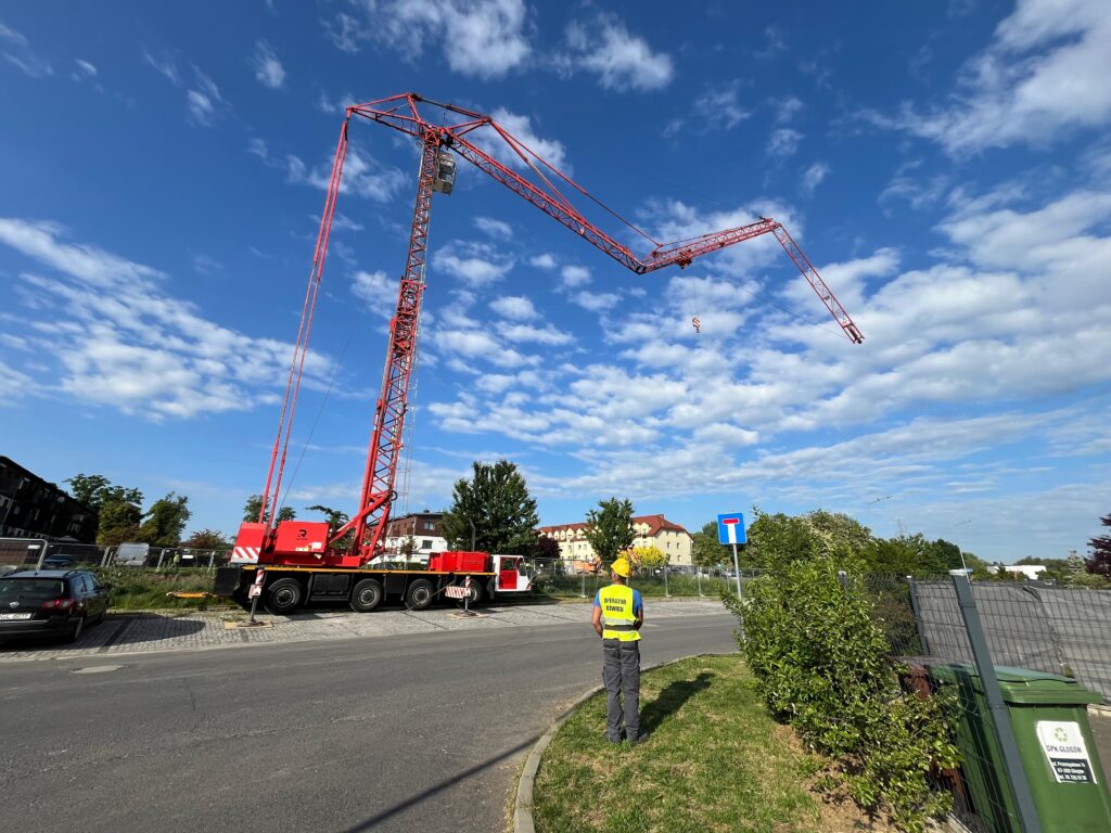 Podczas realizacji inwestycji budowy budynków TBS w Głogowie, prowadzonej przez firmę Pre-Fabrykat, świadczyliśmy specjalistyczne usługi dźwigowe z wykorzystaniem mobilnego dźwigu wieżowego Spierings AT4. Zastosowanie tego typu dźwigu pozwoliło na efektywną obsługę całego placu budowy dzięki jego dużemu zasięgowi roboczemu, obejmującemu wszystkie strefy realizacji inwestycji.