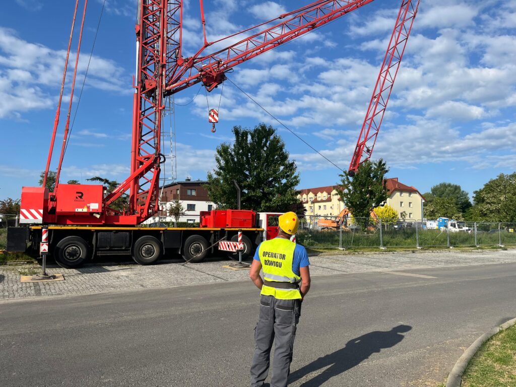 Dodatkowo dźwig obsługiwany był zdalnie – operator sterował maszyną za pomocą pilota, pozostając bezpośrednio przy strefie rozładunku. Pozwoliło to na bieżącą, precyzyjną koordynację operacji podnoszenia oraz ścisłą współpracę z ekipami wykonawczymi, zwiększając bezpieczeństwo i efektywność prowadzonych prac.