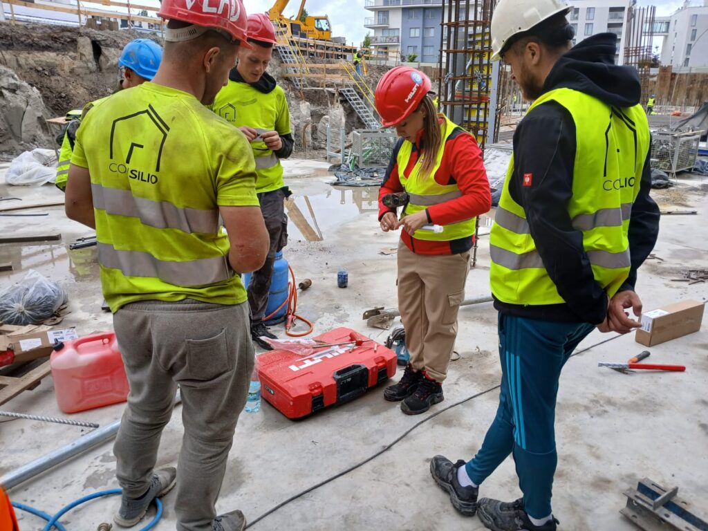 Na zdjęciach widać szkolenie, które przeprowadzaliśmy wspólnie z Hilti Polska dla ekip budowlanych. Szkolenie obejmowało poprawny montaż kozłów oporowych a także ich kotwienie w płycie fundamentowej za pomocą kotew wklejanych Hilti.